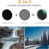 Introducing the K&F Concept 67mm ND4-64 (2-6 Stops) ND Lens Filter, a versatile 2-in-1 filter that combines ND and CPL functionalities for your photography needs. The filter offers a wide range of 2 to 6 stops of neutral density adjustment, allowing you to control the amount of light entering your camera lens with precision.